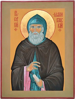 В Житиях святых, собранных свт. Филаретом (Гумилевским), архиеп. Черниговским, с иллюстрациями акад. Ф. Г. Солнцева (Филарет (Гумилевский). Жития. 1892. Нояб. С. 212) С. изображен фронтально, в рост, левая рука прижата к груди, правая согнута в локте и поднята вверх. На нем ряса, епитрахиль (т. е. показано, что он был монахом в сане священника), мантия (похожа на фелонь), на голове куколь; надпись: «С: ПР: СЕРГIЙ МАЛОПИНЕЖСК:». Известен образ С. (в куколе) в группе подвижников XVI в. в росписи галереи русских святых, ведущей в пещерную ц. прп. Иова Почаевского в Почаевской Успенской лавре (работа иеродиаконов Паисия и Анатолия кон. 70-х гг. XIX в.- 1888 г., поновление - 70-е гг. XX в., ок. 2010).