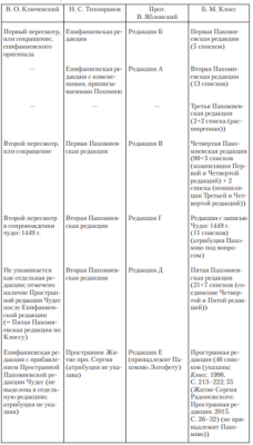 Однако Епифаниевский текст сохранился частично в составе более поздней компилятивной редакции, называемой сейчас Пространной и созданной, по-видимому, не ранее нач. XVI в. Перу прп. Епифания принадлежит 1-я часть Пространной редакции (до гл. «О изведении источника», включая гл. «О худости порт Сергиевых и о некоем поселянине»), 2-я часть Пространной редакции состоит из глав, взятых из разных Пахомиевских редакций Жития.