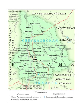 Свято-Пантелеимоновский (женский, в Краснотурьинске; основан в 1995), Свято-Косминская пуст. (мужская, в дер. Костылева городского округа Верхотурский; основана в 2007).