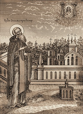 Появление новых икон С. связано с чудесами и обретением его св. мощей в 1860 г. Произведения этого времени больше соответствуют описаниям облика святого в иконописных подлинниках. Возможно, это связано с тем, что перед исцелениями нек-рые видели седовласого старца (в частности, в «светлой одежде»; см.: Смирнов. 1861. С. 247-248, 264-265). К числу единичных памятников редкой иконографии относится образ С. на фоне обители - Воскресенской ц. и окружающих строений, исполненный, судя по деталям архитектуры, не ранее сер. 60-х гг. XIX в. тверским иконописцем (собрание А. В. Дадиани), работавшим в манере, близкой к произведениям столичной мастерской В. М. Пешехонова. Постановка фигуры С., жесты его рук близки к изображению на шитом покрове из ГЭ, но черты лика изменены: волосы святого со значительной проседью, борода более длинная, узкая и волнистая, нежели на покрове, хотя и не достигает длины «Власиевой». Вверху надпись: «Пре Сльвестръ Игм Обнорскïи Чд.». За спиной С. в правой части композиции показаны 5-главая каменная Воскресенская ц. (1825), ограда и св. ворота, слева - жилые и хозяйственные деревянные постройки и часовня на фоне леса. Икона с ростовым образом С., стоявшего на фоне обители, имелась в ц. Рождества Пресв. Богородицы в Старом Симоновом мон-ре в Москве. Образцом для нек-рых икон этого извода, вероятно, послужили эстампы, помещенные в книгах о святом и о его обители: напр., на литографии Ярославской губ. земской управы в 3-м издании сочинения прот. А. К. Братановского о ц. Воскресения Христова на Обноре (1902) в левой части композиции С. предстоит образу Спаса Нерукотворного в облаках над сравнительно условным архитектурным ансамблем мон-ря на фоне лесного пейзажа; на переднем плане справа - небольшая кубическая часовня над источником. У святого короткие волосы и лопатообразная борода до середины груди, взор устремлен к небесам, правая рука в молении, в левой - свиток.
