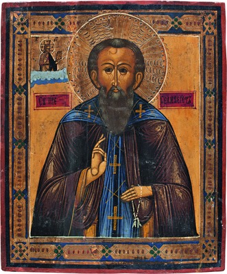 Большинство сохранившихся икон относится к посл. трети XIX в.: это упрощенные по живописи, подносные и «раздаточные» иконы из Воскресенской ц., к-рые (очевидно, небольшими партиями) заказывали местным иконописцам или мастерам из иконописных сел Владимирской губ. В основном С. писали фронтально по пояс или по чресла, с благословляющим жестом (встречаются именословие и двуперстие), в левой руке - свиток (иногда развернут вверх), реже - четки; детали композиции и облика святого (прическа, борода) слегка варьировались. Нередко в левом верхнем углу помещали принадлежавший С. образ Спаса Нерукотворного, напр. на иконах кон. XIX - нач. XX в. (ГИМ, частные собрания), или благословляющего Иисуса Христа на облаках, как на иконе посл. трети XIX в. (частное собрание). Подобная иконография получила распространение и в декоративно-прикладном искусстве: в Ростове Великом для паломников изготовляли многочисленные эмалевые образки (ГМЗРК, ЯХМ, КБМЗ, Саратовский обл. музей краеведения, Курский обл. краеведческий музей, частные собрания), в т. ч. с дополнительным изображением Спаса Нерукотворного (80-е гг. XIX в., мастер круга Н. В. Архарова (А. Т. Виноградов?), ГМЗРК). Близкие по рисунку поясные образы святого отличаются колоритом; ростовые изображения, по-видимому, восходят к тоновой литографии 80-х - нач. 90-х гг. XIX в. с тропарем и кондаком С. (СПГИАХМЗ).