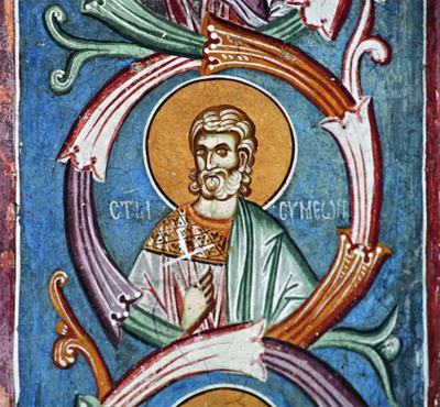 Мученичество С. изображали в составе минейных циклов на апр. Согласно сведениям Синаксаря, переписанного в 1249 г. (РНБ. Греч. 240) визант. мон. Ионой с рукописи XI в., составленной неким Петром, память С., старца 117 лет, приходилась на 14 апр.; (Порфирий (Успенский). 1867. С. 31-32). Под 17 апр. его исповедничество проиллюстрировано в Минологии Димитрия Палеолога, деспота Фессалоники (Bodl. gr. th. f. 1. Fol. 86, между 1322 и 1340): старец с недлинной бородой и высоким лбом, в святительских облачениях, серой фелони и белом омофоре с крупными черными крестами; он стоит на коленях над телами сподвижников с вытянутыми вперед покровенными руками, готовый принять свою усеченную голову. Как С. в росписях ц. прав. Симеона Богоприимца новгородского Зверина мон-ря (ок. 1467, с поновлениями) атрибутируется полуфигура в медальоне на вост. стене под 14 апр.: старец с клиновидной бородой средней длины, с высоким лбом, в святительских крещатых ризах. Н. Н. Герасимов предположил, что это свт. Мартин I, папа Римский, память к-рого отмечается в этот день по Иерусалимскому уставу (Герасимов. 1979. С. 249), однако нельзя исключать, что изображен именно С., чья память, как указано выше, также отмечалась в этот день, в подписи может быть опознана заглавная буква его имени (Введенская. 2010). Как седой святитель в фелони и омофоре С. присутствует в греко-груз. рукописи кон. XV в. (РНБ. О. I. 58. Л. 110; Евсеева. Афонская книга. С. 296. Кат. 145). Его образ представлен в оформлении юго-вост. малого купола кафоликона афонского монастыря Кутлумуш (Τούτος, Θουστέρης. 2010. Σ. 301). В росписях монастыря Дионисиат на Афоне (1546/47, мастер Дзордзис Критский; Ibid. Σ. 246) в минологии показано усечение главы С. На святителе, старце с короткой бородой, лиловая фелонь, серый подризник, на его упавшую главу смотрит стоящий за ним на коленях молодой подвижник в красном; композиция расположена рядом с проемом между нартексом кафоликона и помещением, ведущим в трапезную.
