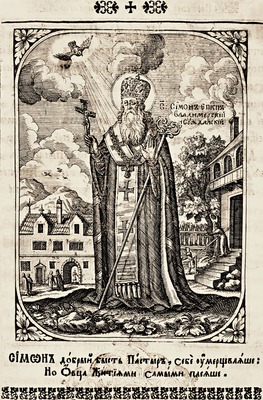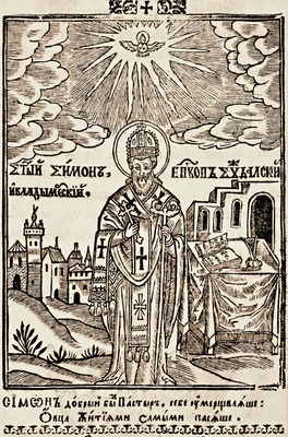 В КПП 1702 г. (дек.) и последующие переиздания XVIII в. (напр., 1762 и 1768) вошла гравюра мастера Леонтия Тарасевича, ориентировавшегося в своих работах на западноевроп. барочное искусство. Основа композиции была заимствована гравером из иллюстрации первых изданий КПП. С. представлен в рост, в легком повороте влево, в правой, отведенной в сторону руке, у него крест-распятие, ладонь левой руки, придерживающей жезл со змеевидным навершием, развернута вовне. Он облачен в рясу, мантию, поверх к-рой омофор, на голове митра. С. показан седовласым мужем с вьющимися пышными волосами до плеч и такой же бородой, достигающей середины груди. Слева к святителю слетает голубь (Св. Дух), заключенный в медальон-мандорлу, от к-рой исходит сияние в виде лучей, развеивающих облачное небо. Справа от нимба надпись: «О Смонъ епкопъ Владимерскй и Сждалскй». На фоне позади С. показаны монастырские строения, а также передана достаточно активная жизнь обители с фигурами монахов и мирян; стол - знак агиографических трудов святителя - отсутствует.