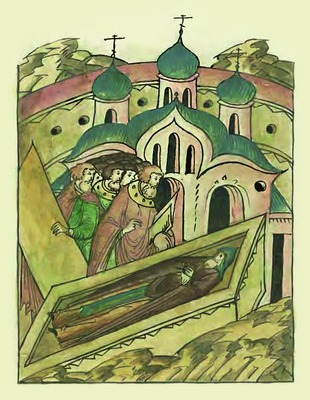 С. сообщает о чудотворных реликвиях Успенского собора Печерского мон-ря - золотом поясе и венце, к-рые Шимон, сын варяжского кн. Африкана (Офрика), привез на Русь из Скандинавии, где они украшали большое Распятие с изображением Спасителя (высотой 10 локтей, т. е. ок. 4,5 м). Киевский блгв. кн. Ярослав (Георгий) Владимирович Мудрый (1019-1054) тепло принял заморского гостя и со временем определил на службу к своему сыну кн. Всеволоду (Андрею) Ярославичу († 1093). Молитва преподобных Антония и Феодосия Печерских спасла варяга от смерти в битве на р. Альте, когда дружины Ярославичей потерпели сокрушительное поражение от половцев (1068). В благодарность за это Шимон передал печерским старцам священные предметы, следуя в т. ч. и знамению, указавшему на пояс как на меру величины буд. Успенского собора. Вместе с домочадцами, с иереями и со слугами он перешел в Православие, получив новое имя - Симон. Игум. Феодосий, с к-рым варяг особенно сблизился, обещал после кончины молить Бога не только за монастырскую братию, но и за весь его род («до последних рода вашего»). Симон (Шимон) был первым погребен в стенах новой Печерской церкви. Его расположение к мон-рю унаследовал сын Георгий. Заботам Георгия Киевский блгв. кн. Владимир (Василий) Всеволодович Мономах (1113-1125) поручил своего малолетнего сына Юрия, к-рому предстояло править в далеком Залесском крае. Впосл. кн. Юрий Долгорукий сам вокняжился в Киеве (с 1149), а своему кормильцу, как отцу, доверил блюсти всю Суздальскую землю. Георгий за свой счет оковал раку прп. Феодосия, выделив для этой цели 500 гривен серебра и 50 гривен золота. С. приводит письмо, в к-ром суздальский тысяцкий увещевает своих потомков не изменять семейной традиции: жертвовать в пользу Киево-Печерского мон-ря и быть погребенными на его земле. Для этого необязательно искать место в Успенском соборе, подойдет и монастырское село, ведь молитва преподобных отцов не знает границ. В заключение С. отмечает, что правнуки Георгия имеют свой некрополь в суздальском мон-ре вмч. Димитрия Солунского. Актуальность этого фамильного захоронения в свете завещания Георгия определялась тем, что Димитриевская обитель в Суздале была дочерней по отношению к Киево-Печерскому мон-рю.