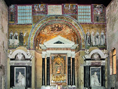 В конхе - редуцированная и кардинально переработанная композиция, напоминающая сцену «Вознесение». В верхней части представлено погрудное изображение Христа с 2 парящими среди разноцветных облаков ангелами по сторонам. В нижней - Богоматерь в позе оранты, вместе с апостолами Петром и Павлом, со св. Иоанном Крестителем, с ап. Иоанном Богословом и со священномучениками Венанцием и Домнием, еп. Салоны. По краям к этой группе примыкают изображения Римских пап: слева - заказчика декорации папы Иоанна IV в традиционной позе донатора с моделью оратория на вытянутых руках, справа, как считается,- сменившего его на Папском престоле Теодора I (642-649).