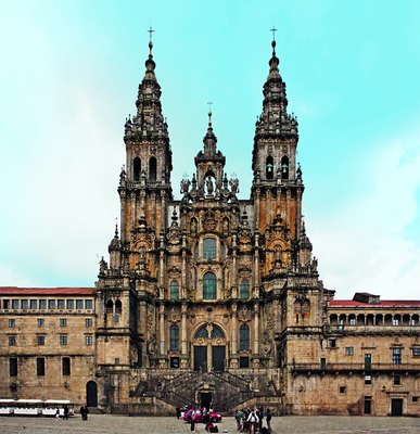 - крупнейшее романское сооружение Испании. Строительство храма над главной святыней Испании и 3-й по значимости святыней христ. мира после Иерусалима и Рима, могилой ап. Иакова Старшего, в том виде, к-рый сохранился до наст. времени, началось в 1075 г., при кор. Альфонсо VI и еп. Диего Пелаэсе. В 1111 г. здесь был коронован буд. король Галисии, Леона и Кастилии Альфонсо VII. Согласно «Codex Calixtinus» (1-я пол. XII в.), мастерами собора были Бернард Старший, «изумительный мастер», и его помощник Роберт, а также скульптор Стефан, уехавший в Памплону в 1101 г.; заканчивал этот этап строительства Бернард Младший, вероятно сын Стефана. В 1122 г. были окончены работы в хоре и трансепте. К 1140 г. было построено уже 6 травей нефа. В 1168 г. руководителем строительства стал мастер Матео, он возвел крипту в зап. части собора, роскошный зап. портал (ок. 1188) и хор (ок. 1200). В 1211 г. состоялось окончательное освящение храма архиеп. Педро Муньисом (1207-1224) в присутствии кор. Альфонсо IX (1188-1230). В соборе были похоронены последние короли Леона Фернандо II (1157-1188) и Альфонсо IX; кор. Альфонсо VII сделал целый ряд пожертвований и распоряжений, чтобы быть похороненным в соборе, однако был погребен в Толедо.