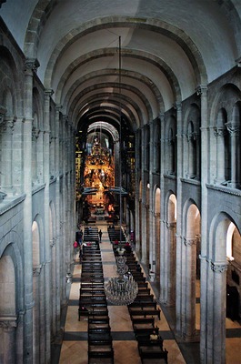 Романский храм полностью сохранил интерьер, но лишь отчасти - наружные формы: утрачены весь зап. фасад (кроме портала Славы), башни, перестроены апсиды и др. Храм является замечательным произведением франц. романского стиля, хотя в его возведении принимали участие и местные мастера. Собор в С.-де-К. относится к типу т. н. паломнических базилик, являясь главной из них; остальные - Сен-Мартен в Туре (ок. 1070 - ок. 1100; не сохр.), Сен-Марсьяль в Лиможе (освящена в 1095; не сохр.), Сент-Фуа в Конке (ок. 1040-1130) и Сен-Сернен в Тулузе (ок. 1070-1119) - были построены во Франции и отмечали узловые точки на путях паломников к гробу ап. Иакова. Эти храмы имели ряд особенностей, связанных с постоянным потоком паломников: круговой обход храма (через боковые нефы наоса и трансепта и за алтарем), причем в обоих ярусах, капеллы в трансепте (по 1 - в Конке и Лиможе, по 2 - в остальных храмах, с вост. стороны каждого рукава) и за апсидой (3 - в Конке и 5 - в остальных храмах), в которых и хранились реликвии. Собор Сантьяго имел 8-гранную башню над средокрестием, 2 массивные квадратные башни по сторонам зап. фасада, а также небольшие башни по углам трансепта и у его пересечения с боковыми нефами. В интерьере четко выражена вертикаль: при высоте 22 м главный неф имеет всего 8 м в ширину; она подчеркнута наложенными на пилоны полуколоннами, тянущимися от пола до подпружных арок цилиндрического свода. Под зап. частью нефа, находящейся на склоне, была устроена крипта. Архитектура интерьера, сдержанная и величественная, контрастировала со скульптурными украшениями порталов и роскошным внутренним убранством (серебряный, покрытый золотом антепендиум, украшенный эмалями киворий, драгоценные светильники и т. п.). С XIV в. упоминается уникальная кадильница (botafumeiro), крупнейшая в мире. Использующееся в наст. время ботафумейро было создано в 1851 г., оно весит 62 кг при высоте 1,5 м и диаметре 59 см. Оно подвешено в средокрестии и с помощью веревки длиной 65 м в процессе богослужения раскачивается вдоль трансепта, достигая его сев. и юж. концов.