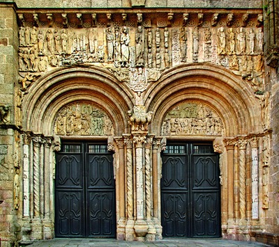 Ок. 1188 г. мастер Матео перекрыл перемычками дверные проемы зап. портала, о чем сообщает торжественная надпись на нем; скульптурное убранство портала могло быть создано как до, так и после этого. Трехчастный портал Славы является выдающимся произведением европ. романской скульптуры, в его создании участвовал не только Матео, но как минимум еще 3 мастера. В центральном тимпане объединены иконографии «Страшного Суда» и «Видения ап. Иоанна Богослова». Христос Судия изображен с обнаженным правым боком, как в ц. Сент-Фуа в Конке (ок. 1130-1135) и в базилике Сен-Дени (1140). Его окружают 4 евангелиста с символами; в нижнем ярусе стоят ангелы с орудиями Страстей. Фигуры 24 апокалиптических старцев, помещенные перпендикулярно к архивольту, образуют тяжелую раму вокруг тимпана. На разделительном столбе врат помещен восседающий на троне ап. Иаков Зеведеев. На левом откосе установлены скульптуры пророков Моисея, Исаии, Даниила и Иеремии; на правом - апостолов Петра, Павла, Иакова Зеведеева и Иоанна Богослова. Тема правого портала - «Страшный Суд», левого - ветхозаветные прообразовательные сцены. Скульптуры мастера Матео объемны, пластичны, подвижны; лица обладают яркой индивидуальностью. В портале Славы объединились веяния раннеготической скульптуры севера Франции и позднероманских рельефов Бургундии.