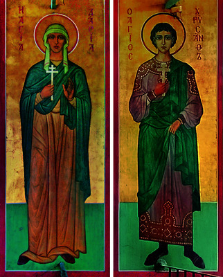 Парные иконы Х. и Д. встречаются редко. На маленькой иконе (11,8×8,5 см) кон. XVIII - нач. XIX в. (ОМИИ; Госкаталог РФ № 32469341) святые представлены в рост в 3/4-ном развороте друг к другу. У Х. русые волосы до плеч, короткая борода; на нем короткая синяя туника, поверх к-рой надеты желтая безрукавка и длинный красный плащ, на ногах поножи и черные сапоги. Д. одета в длинное красное платье, поверх него зеленая тога по колено и красный плащ, на ногах обувь черного цвета, на голове - белый плат. В правой руке каждого - крест, левая рука опущена. На иконе кон. XIX - нач. ХХ в. (КОКМ; Госкаталог РФ. № 36901480) святые изображены в той же иконографии, но только Х. здесь юноша с короткими кудрявыми волосами, на нем длинная светло-зеленая тога и красный плащ, на ногах сапоги. Д. стоит с чуть склоненной головой; она одета в длинное светло-охристое платье, из-под к-рого видны мыски черной обуви, и зеленый плащ, на голове белый плат, из-под к-рого вьются распущенные волосы, спускаясь на плечи. Х. держит крест и пальмовую ветвь, Д.- крест и раскрытый свиток.