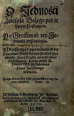 Неск. произведений С. были связаны с подготовкой церковной унии. В 1574 г. по приказу главы Польской провинции ордена иезуитов Франсиско Суньера (1567-1577), сторонника активной миссионерской деятельности иезуитов на Востоке, С. написал соч. «О единстве Церкви Божией...», к-рое было издано в 1577 г. с посвящением князю и магнату Константину Константиновичу Острожскому (1526-1608). В сочинении он изложил свое видение унии и путей ее реализации. С. в ярких красках обрисовал кризис правосл. Церкви, в резких тонах обвинил «греков» в распаде церковного единства, назвав Божией карой падение К-поля, потребовал от «греков» подчиниться папе Римскому, признать католич. догматы, отказаться от церковнослав. языка и от визант. обряда в богослужении. Из 2-го издания, к-рое вышло в 1590 г. с измененным названием «Об устройстве и единстве Божией Церкви под единым пастырем и о греческом и русском от того единства отступничестве» (O rządzie y iedności Kościoła Bożego pod iednym pasterzem i o greckim y ruskim od tey iedności odstąpieniu) и с посвящением кор. Сигизмунду III (в нем С. видел главного гаранта церковного единства), требование смены богослужебного обряда было убрано; в издании 1610 г. были изъяты разделы об ошибках в богослужении и о причинах упадка Церкви. В правосл. среде сочинение С. восприняли как декларацию превосходства Римской Церкви над «греческой», как угрозу подчинения Риму под давлением гос-ва; часть тиража книги была выкуплена и сожжена.