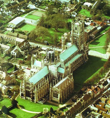 Строительство собора И. (самого длинного в Великобритании - 163,7 м) было начато в 1083 г., при аббате Симеоне, и завершено в нач. XII в., при его преемнике аббате Ричарде. Построенный в романском стиле, собор в плане крестообразный с 2 большими и 2 малыми башнями. Длинный главный неф (13 пролетов, более 75 м) представляет собой трансформацию «каннского» типа вертикали в Англии (использовались 2 вспомогательные арки в проемах главной аркады и галереи) и демонстрирует вариант чередования колонн цилиндрической и сложной формы. В XIII в. к входу зап. фасада была пристроена галилея (портик). Центральная башня над пересечением рухнула в 1322 г., на ее месте был сооружен уникальный 8-угольный фонарь. Тогда же были перестроены пострадавшие при обрушении хоры. В те же годы к сев. трансепту была пристроена капелла Пресв. Девы Марии, выполненная в стиле англ. готики XIV в. с характерными для нее изогнутыми линиями ажурной каменной работы и обилием орнаментальной скульптуры. Автором проекта, как считается, был ризничий Алан Уолсингем. В XV в. произошло обрушение сев.-зап. трансепта, к-рый так и не был восстановлен. В сер. XVII в. Кристофер Рен установил выполненную в готическом стиле дверь в сев. фасаде собора.